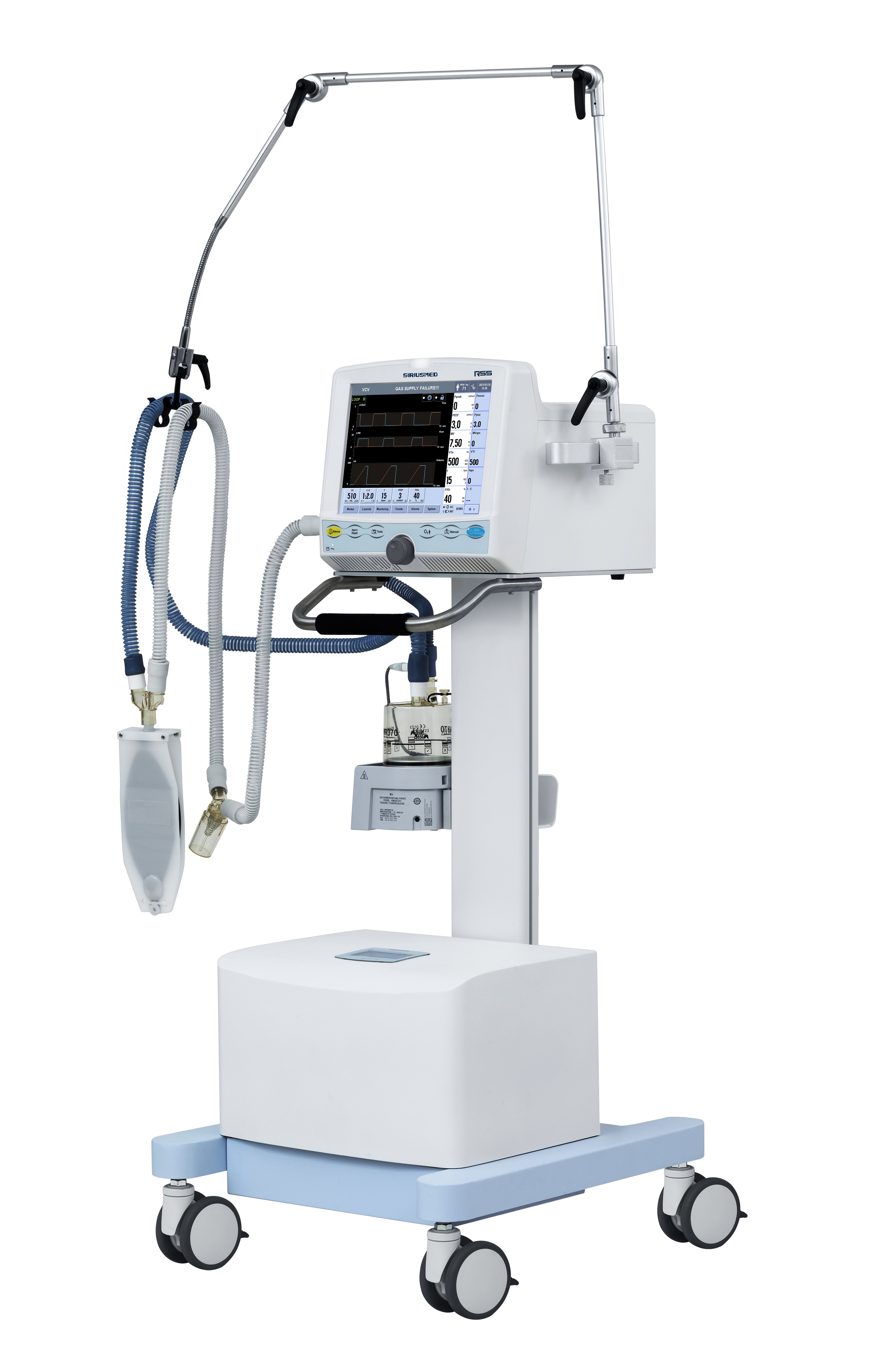 Covid-Ventilator R55-Easy, zum der ergonomischen Laufkatze mit zwei Bremsen, HFNC in Position zu bringen.